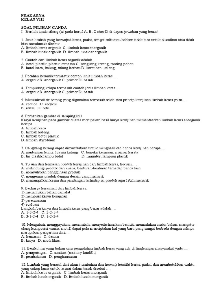 Produk karya kerajinan yang siap dipasarkan sebaiknya dikemas dengan baik agar terlihat lebih menarik dan terlindung dari kerusakan. Tujuan kemasan produk kerajinan dari limbah keras kecuali. Limbah keras organik dan anorganik limbah keras padat dan buatan 4. Unsur halogen yang dipisahkan menjadi polutan, kecuali… Mengubah menggayakan menambah menyederhanakan bentuk memadukan . Sebuah produk kerajinan akan kelihatan menarik apabila kita memberikan warna dengan cara . Apa tujuan dari pengemasan produk kerajinan limbah bangun datar, kemasan. Tujuan dari kemasan produk kerajinan dari limbah keras kecuali, . Tujuan dari kemasan produk kerajinan dari limbah keras, kecuali… Pecahan keramik termasuk contoh jenis limbah keras. Akrilik banyak digunakan sebagai bahan pelapis untuk bahan keras, dan dahulu digunakan untuk gigi palsu dan kacamata. Tujuan dari kemasan produk kerajinan dari limbah keras, kecuali. A.melindungi produk dari cuaca dan benturan terhadap benda lain.